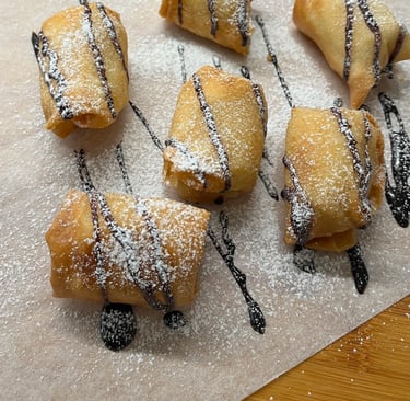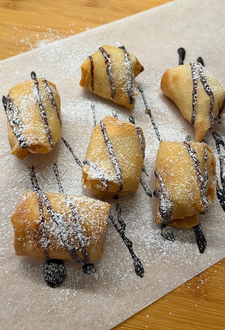 Häll matoljan i en kastrull på medelvärme. När oljan är varm, lägg bananrullarna i oljan. Stek dem ca 2 minuter på varje sida.