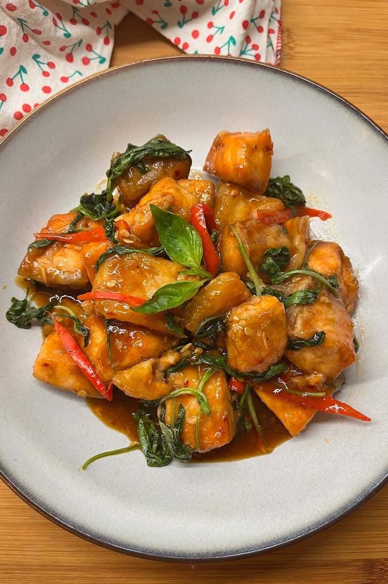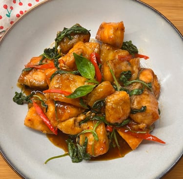 Blanda ingredienserna till såsen i en liten skål. Häll sedan såsen i en wokpanna, rör om ca 1 minut på medelvärme. Tillsätt laxen, vatten, chili och basilika. Rör om snabbt tills såsen är marinerad i laxen ca 1-2 minuter.