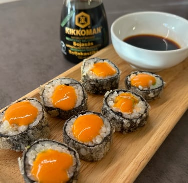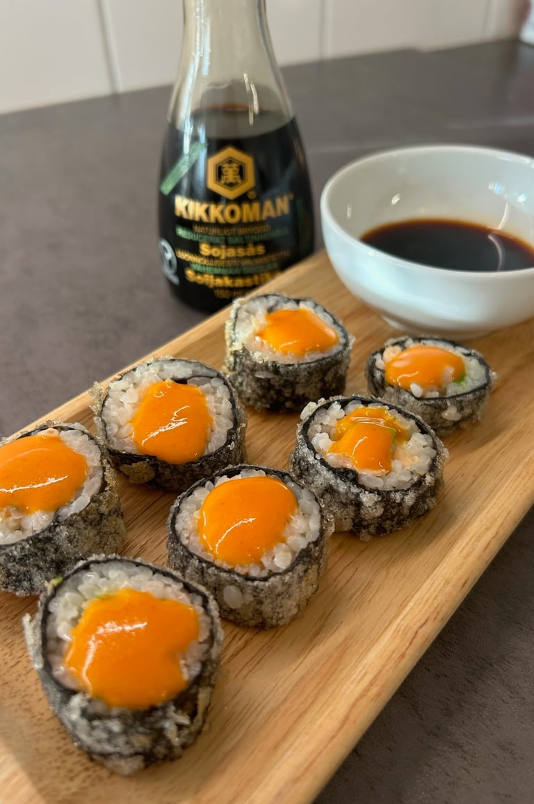 Skär sushin i små bitar på ca 3 cm och lägg en tesked Sriracha chili mayo på varje bit.