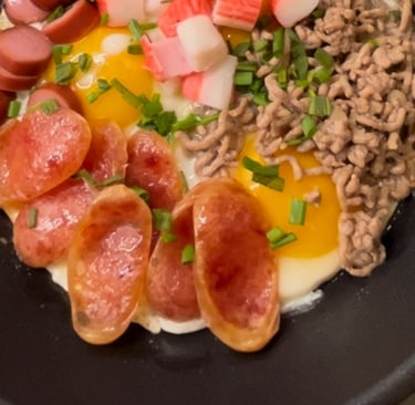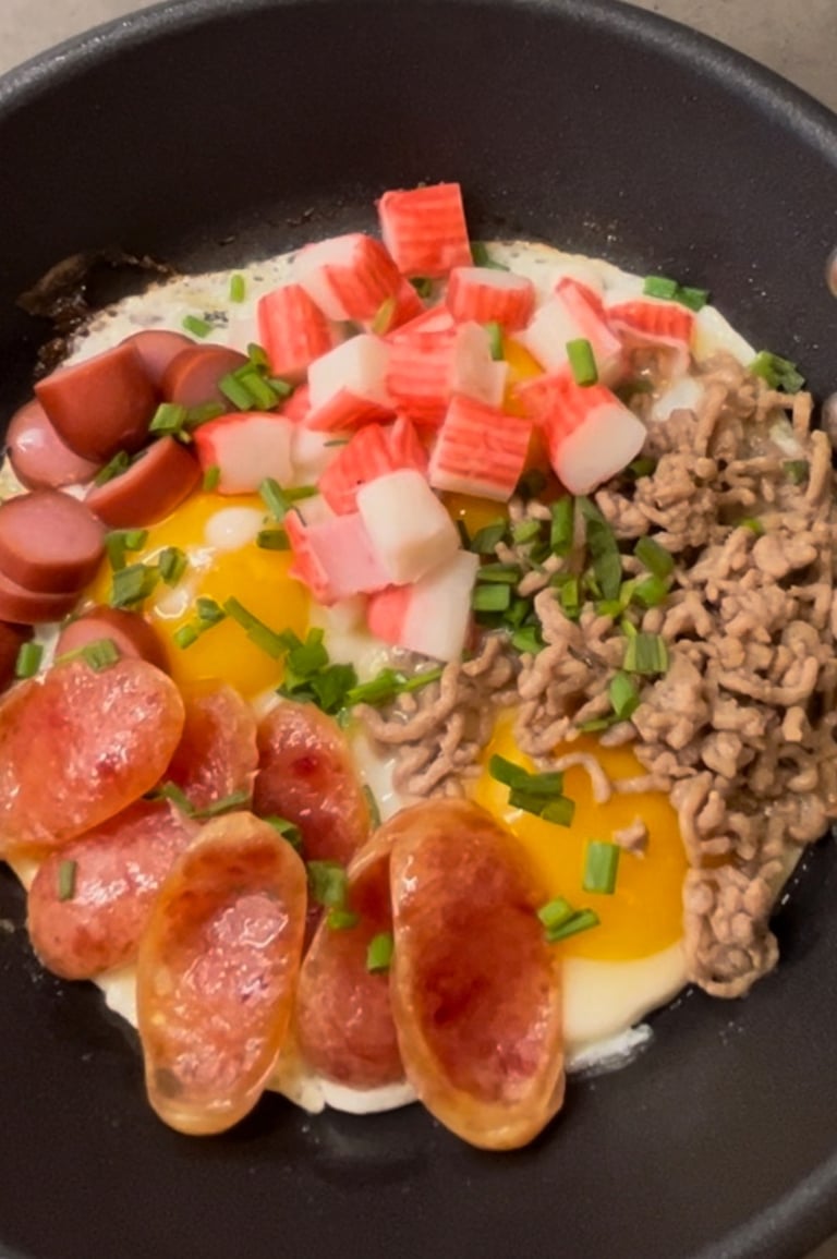 Lägg smör i en liten stekpanna och knäck däri 3 ägg. Tillsätt kött, korv och surimi. Låt koka i ca 5 min på medelvärme.