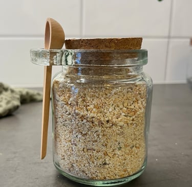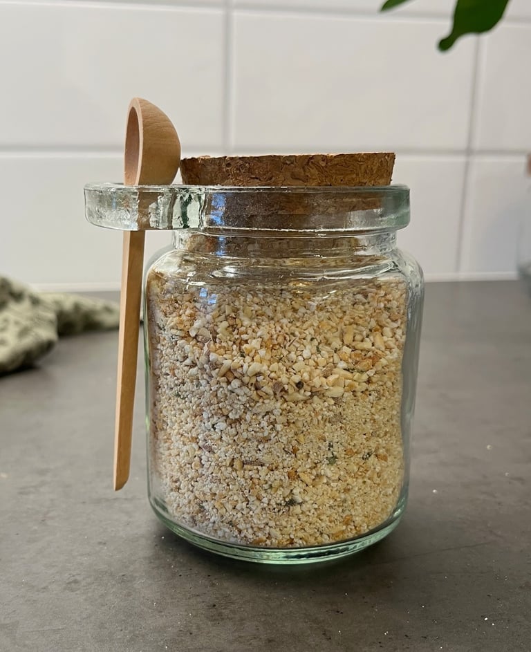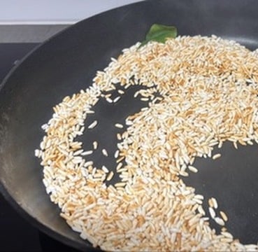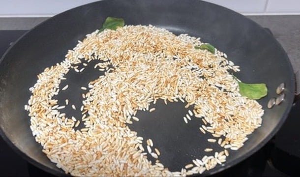 Rosta det råa riset, limeblad och citrongräs i en torr stekpanna, under konstant omrörning, på medelvärme i ca 10 min. När riset börjar ändra färg från vitt till djupt gyllenbrunt och limebladen & citrongräset blir torrt och krispigt, ta upp och blanda allt i en elektrisk kvarn (alt mortla dem) till ett grövre pulver, typ ströbröd.