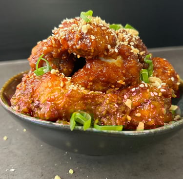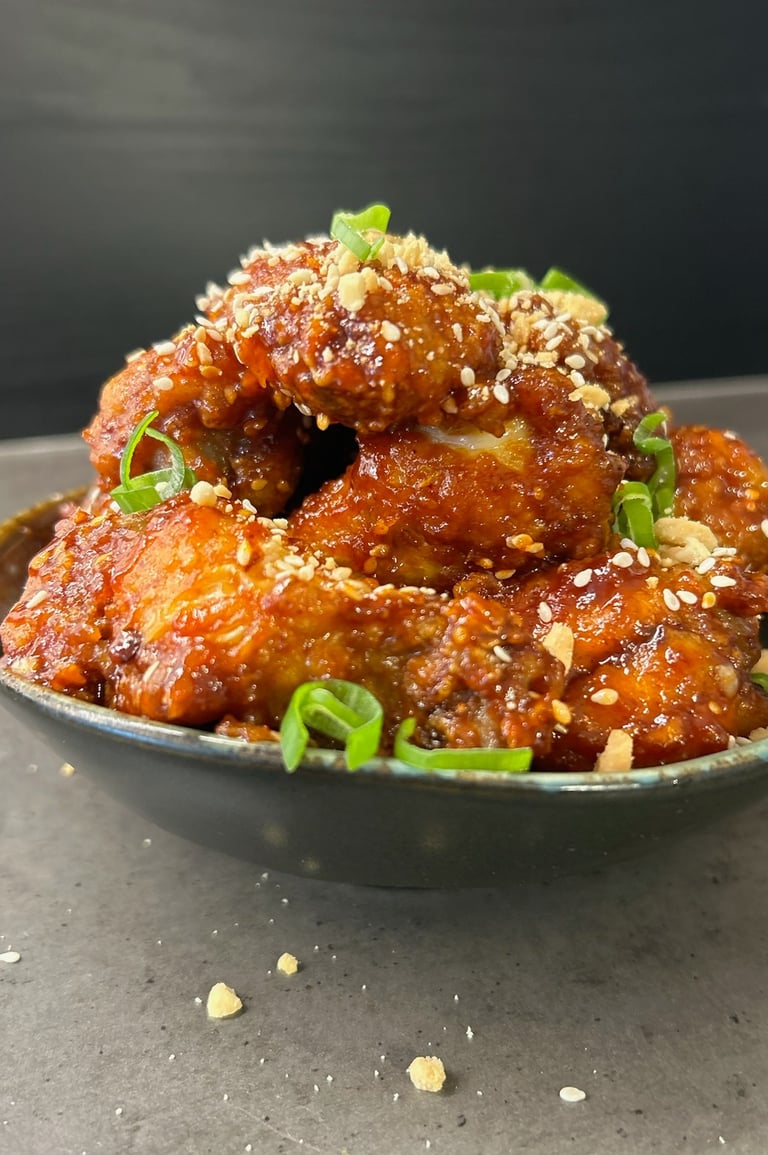 Garnera med sesamfrön, krossade nötter och finhackad salladslök. Njut av koreanskt friterad kyckling!