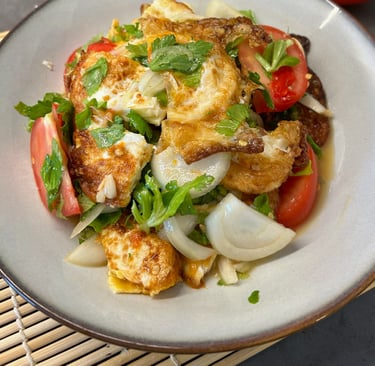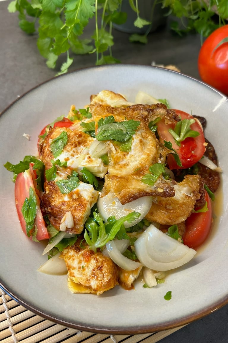 Stek äggen i matolja på båda sidor tills den vita är krispig och den gula är genomstekt. Låt äggen svalna och skär sedan varje ägg i 4 bitar. Ställ åt sidan.