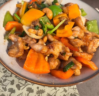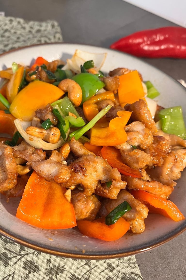Tillsätt sedan såsen och fräs 1 minut. Lägg i cashewnötterna sist.