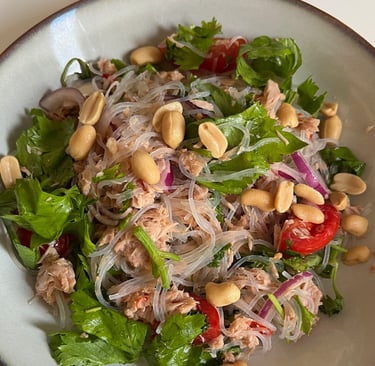 Lägg i nudlarna. Sila av oljan från tonfisken och rör ner tonfisken i skålen.