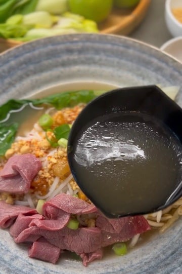 När buljongsoppan är klar, sila av köttbenen och alla grönsaker med sil. Behåll buljongen och låt det sjuda medan du förbereder nudlarna och grönsakerna.