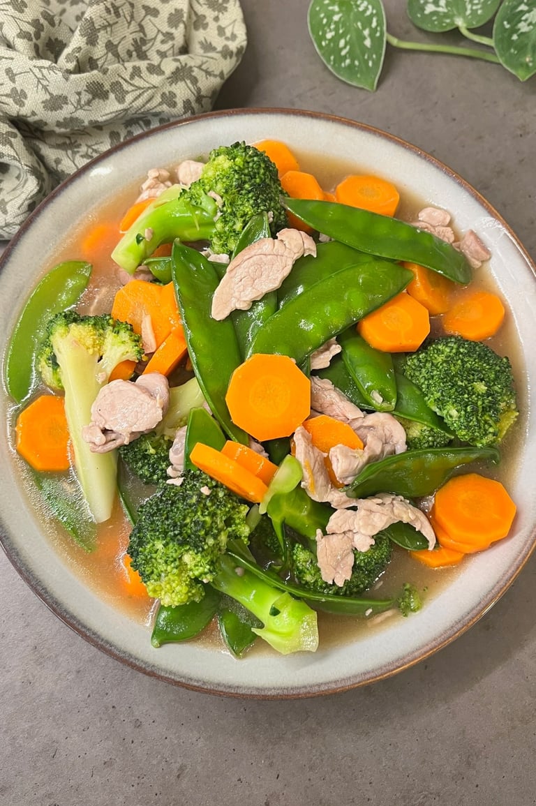 Fräs vitlöken i matoljan, lägg i köttet och stek tills det blir genomstekt. Häll sedan i grönsakerna, blanda såsen och majstärkelsen och rör om ca 3 minuter. Tillsätt vitpeppar. Klart!