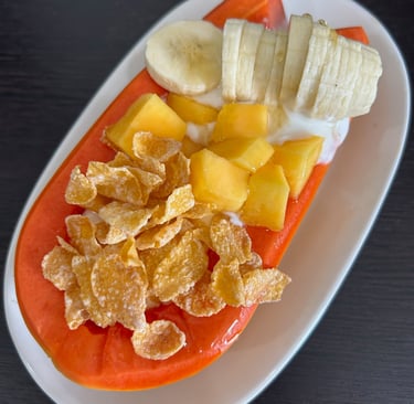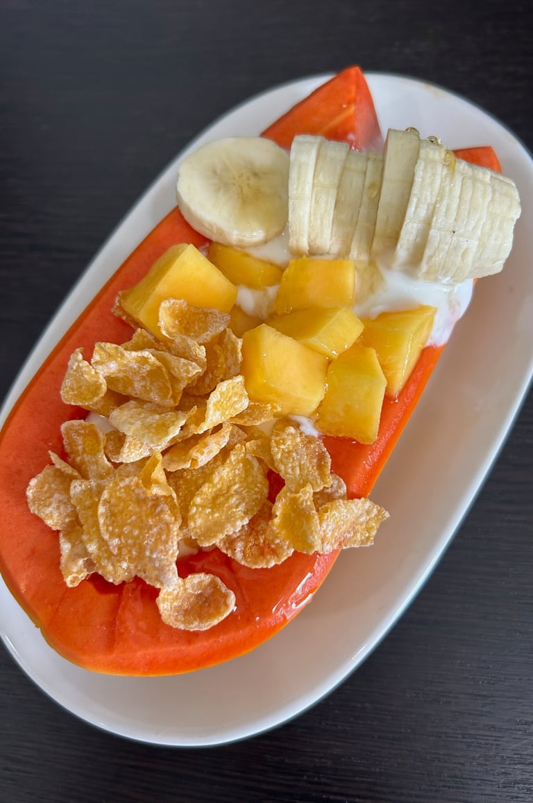Om du älskar den söta smaken av frukt, yoghurt och honung måste du verkligen prova detta. En läcker och enkel papaya bowl som du kan anpassa efter dina egna smaker och preferenser. Du kan välja dina favoritflingor, müsli eller granola för att ge en krispig kontrast till de mjuka frukterna. Tillsätt en härlig blandning av mango och banan eller vilka favoritfrukter du föredrar. Var kreativ och experimentera med olika frukter, bär och nötter för att ge din frukost en extra twist.