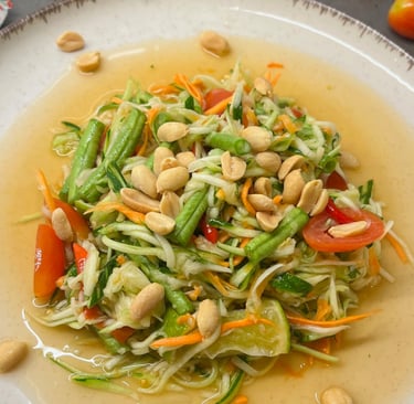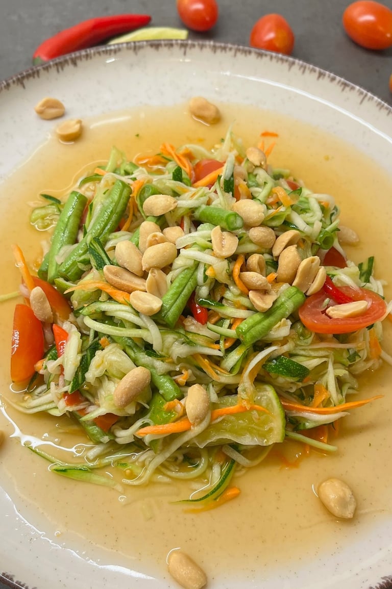 Tillsätt fisksås, socker, lime och rör om. Tillsätt sedan zucchinin, moroten och tomaterna och blanda väl.
