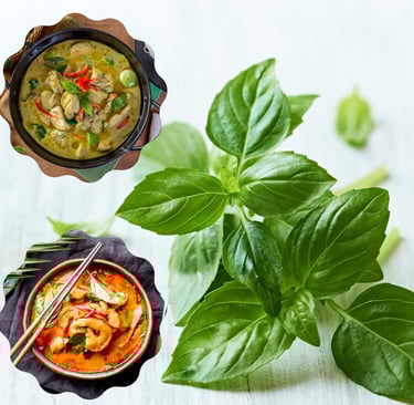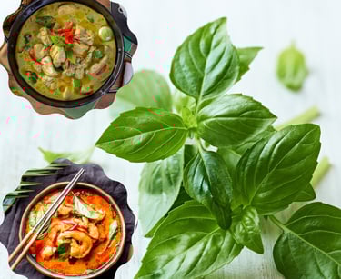 Söt basilika (Bai-Ho-ra-pa på thailändska): Bladen har en distinkt aromatisk doft och en lätt söt smak, vilket gör dem populära i många rätter. Sötbasilika används ofta i många curryrätter, både röd curry och grön curry, som till exempel Geang Keaw Wan.