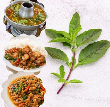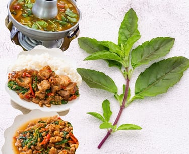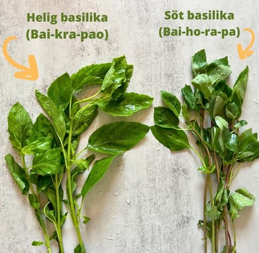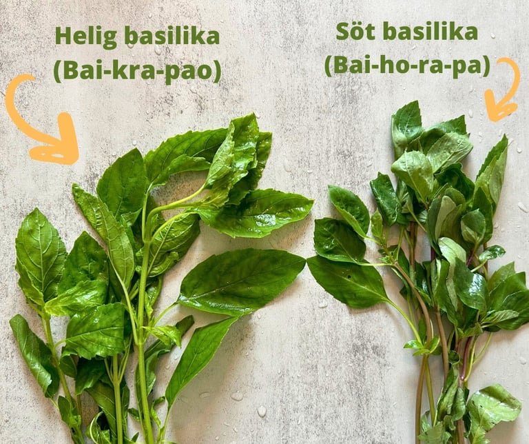 Helig basilika (Bai-Kra-Pao på thailändska): Den har gröna veck runt bladen med en pepprig smak och en stark, kryddig doft. Den används i populära rätter som Pad Kra Pad och även Tom Yum.
