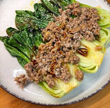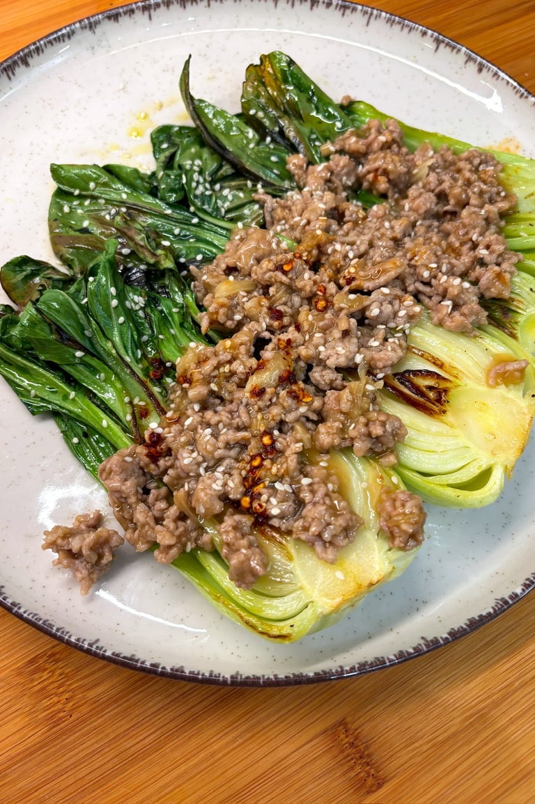 Dela pak choi på längden. Stek pak choi på hög värme i matoljan tills den får färg. Ta upp och ställ åt sidan.
