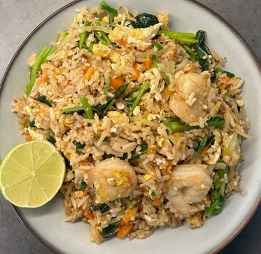 Skjut räkorna åt ena sidan av woken och tillsätt äggen på andra sidan. Rör om äggen lite grann. När äggen är halvstekta kan de blandas med räkorna.