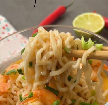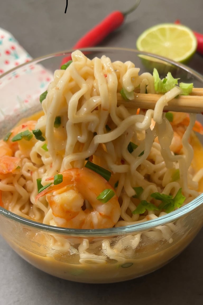 Tillsätt nudlar och räkor och låt koka i ca 5 minuter.
