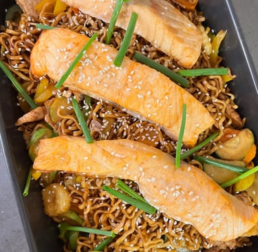 Lägg nudlarna i en skål och toppa med lax, salladslök och sesamfrön.